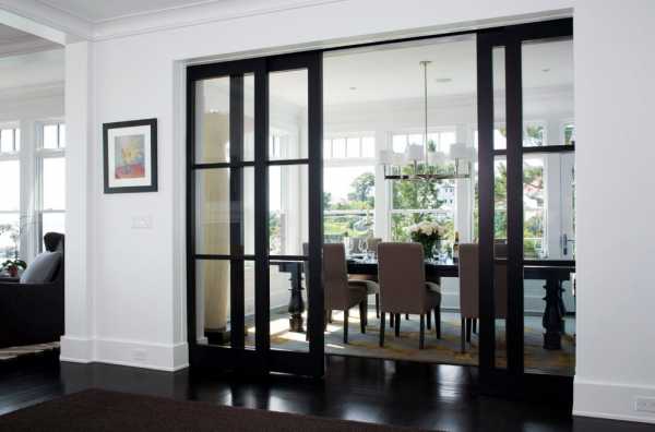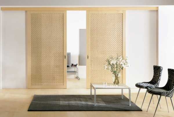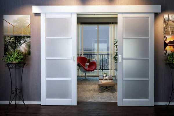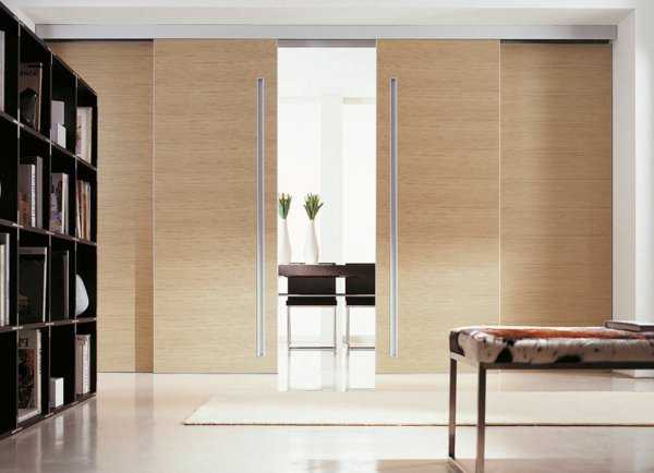 Коль мы говорим именно о квартирах, то в них можно часто видеть двери-купе. В таком случае дверное полотно двигается по специальным рельсам, которые закреплены на поверхности пола и потолка. Существуют модели с разным количеством створок. Работа этих дверей тихая и мягкая.