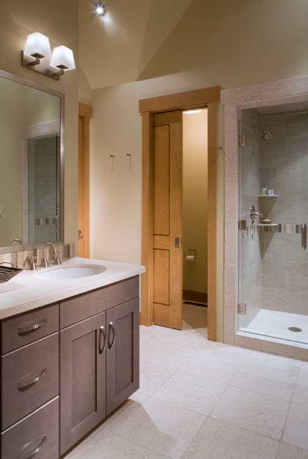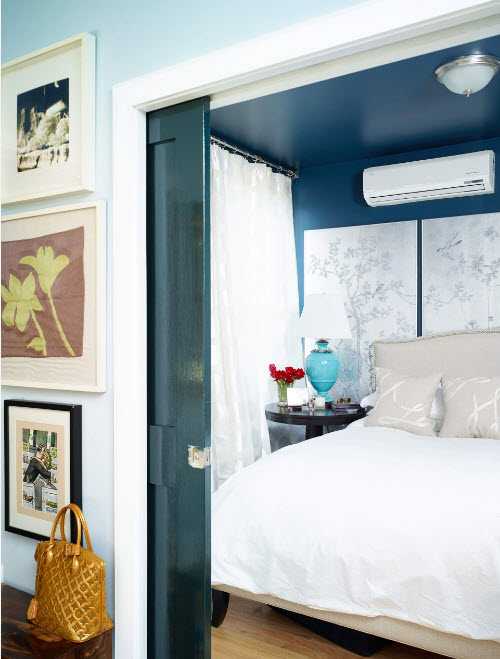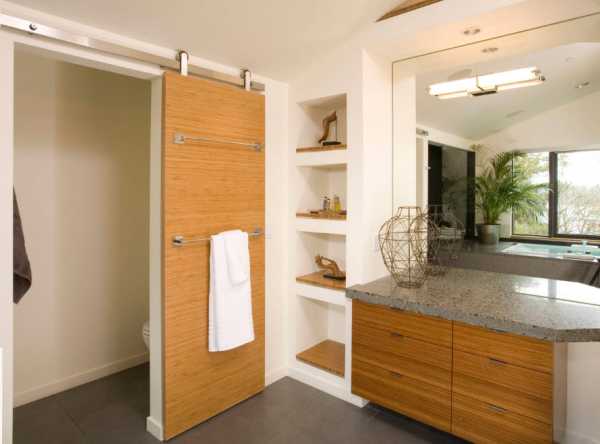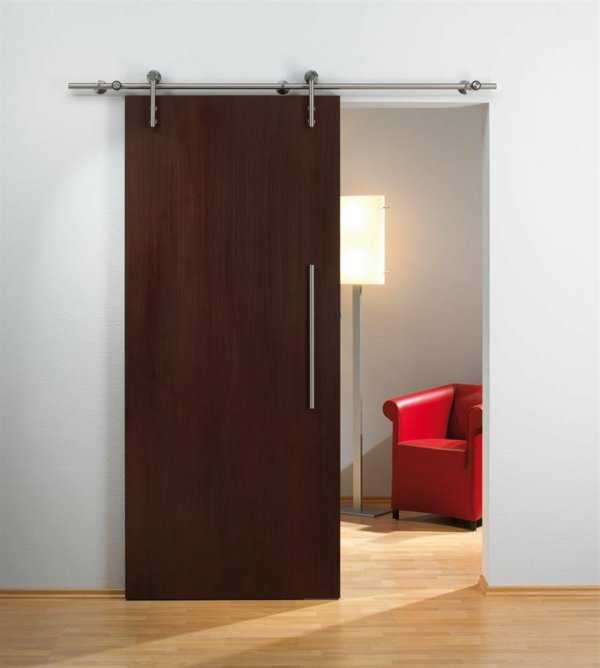 Согласитесь, что распашная дверь в открытом состоянии занимает немало полезного пространства комнаты, да и на само открывание необходим определенный запас площади. В малогабаритных помещениях дизайнеры предлагают использовать вариации раздвижных дверей. Первый способ создания такой конструкции – размещение дверного полотна между двух рельс, которые крепятся к потолку и полу. В результате мы получаем раздвижное полотно, действующее по принципу дверей в купе. В последнее время этот способ создания изолированности помещения упростили до одной подвесной рельсы или штатива, который крепится к стенам над дверным проемом. Таким образом, можно экономить пространство небольших помещений, но важно понимать, что вплотную к стене в месте перемещения дверного полотна мебель или другие предметы интерьера установить нельзя будет.