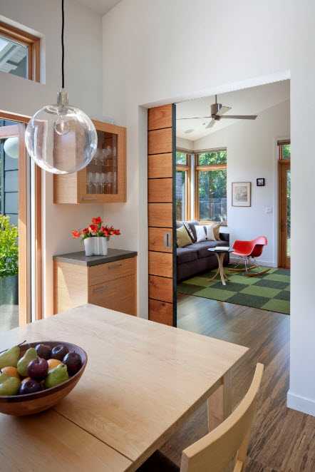 Дерево не только сообщает комнате ощущение близости к природе, но и имеет приятную текстуру, которая делает его особенно привлекательным, как на фото выше. Часто дерево комбинируют со стеклом; кроме того, существуют модели раздвижных межкомнатных дверей, которые не только экономят пространство, но и стильно смотрятся.