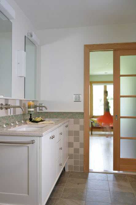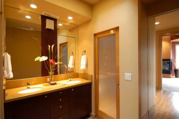 Матовое стекло уместно в любой комнате: не видно, что происходит внутри помещения, а вот тусклый свет, проникая сквозь матовую поверхность, освещает ночной коридор