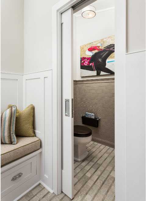 Отличный способ «замаскировать» дверной проем – установка двери со скрытым коробом. В этом случае дверное полотно монтируется в проем в одной плоскости со стеной. Особенностью установки является отсутствие наличников. Благодаря выбору единого оттенка для дверного полотна и стены возникает эффект «невидимой» двери.