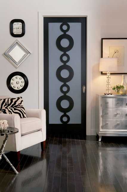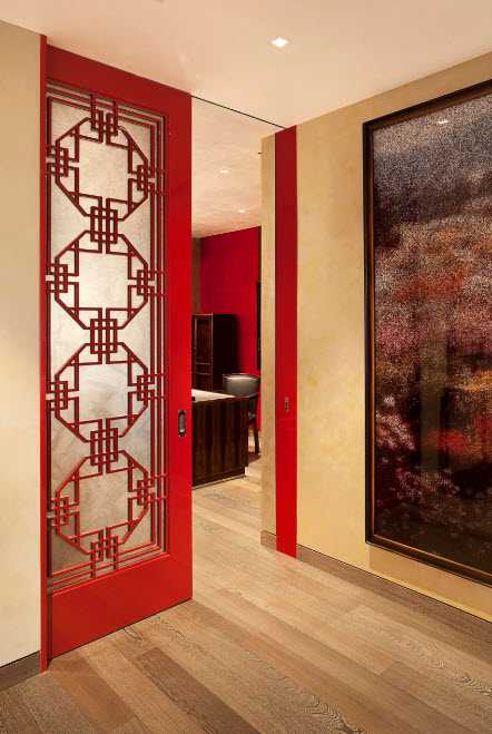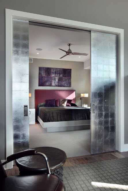 Двери современных интерьеров отличаются нотками креативности. Если хочется установить стеклянные двери, то уместно выбрать яркие насыщенные оттенки. Дизайнеры предлагают также дверные полотна с монохромными фотообоями или декоративным узором/орнаментом. Причем очень стильно смотрятся раздвижные двери, декор которых выполнен пескоструйной обработкой.