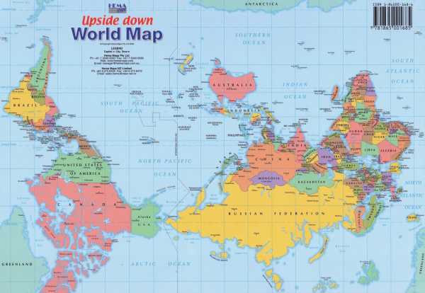 Существует общий стереотип, что доминирует то, что находится выше, а то что ниже — находится в подчинённом положении. Австралийцы не только проводя вертикальную ось мира через свой материк, так ещё и помещают его сверху всех других, переворачивая карту на 180 градусов. Подобно США, они оказываются островом лежащим между тремя океанами: Тихим, Индийским и Южным. Ещё важную роль начинает играть Антарктика, спрятанная в самый низ на всех прочих картах.