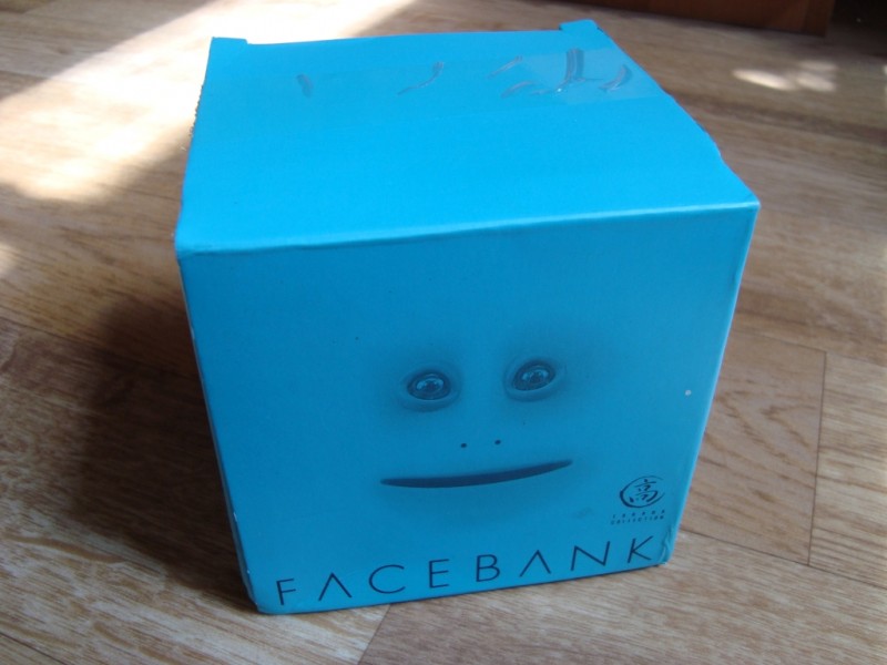 Всем привет. У меня в стране менее чем через месяц в оборот выпустят монеты, поэтому пару месяцев назад возникла мысль купить какую-нибудь прикольную копилку. Сам товар не новый, уже несколько лет можно купить в интернете, но это не помешало видосу с этой копилкой набрать на моем канале миллион просмотров. Если вы хотите сделать человеку какой-то необычный подарок, то это отличная вещь! А еще она меня перепугала до ужаса, но обо все по порядку.Заказывал копилку на ebay. В марте был сделан заказ. На сколько быстро прилетела посылка я уже не вспомню, но упакована была отлично: продавец обернул коробку в несколько слоев вспененной подложки. Сама копилка находится внутри голубой коробки с надписью Facebank — «мордобанк».