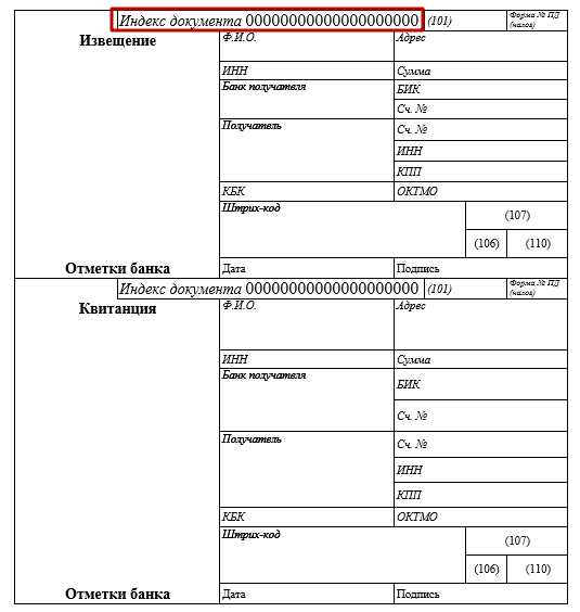 Так, УИН в платежках для физлиц формируется по-особому. Когда человек перечисляет в казну какие-либо налоги или сборы – например, земельный или имущественный по извещению – роль уникального идентификатора начисления играет индекс самого извещения-квитанции (см. рисунок ниже).