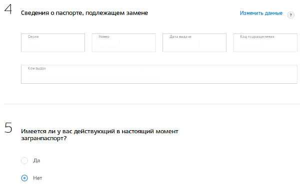 На четвертом шаге укажите данные вашего старого паспорта, а на пятом информацию о наличии у вас загранпаспорта.