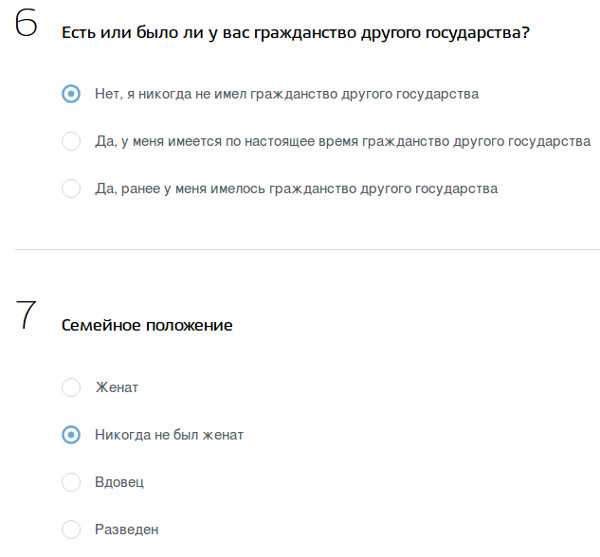 Выберите имеется ли у вас зарубежное гражданство и ваше семейное положение