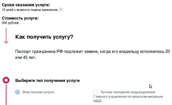 Вам необходимо выбрать свою причину необходимости произвести замену паспорта РФ, а мы, в качестве примера, рассмотрим вариант с достижением 20 или 45 лет. После нажатия на нужный пункт, мы попадаем на описание услуги, в которой мы узнаем, что стоимость услуги составляет 300 рублей, а по срокам это занимает 10 рабочих дней с момента подачи заявления. Выбераем тип получения услуги - "Электронная услуга" и нажимаем на кнопку "Получить услугу".