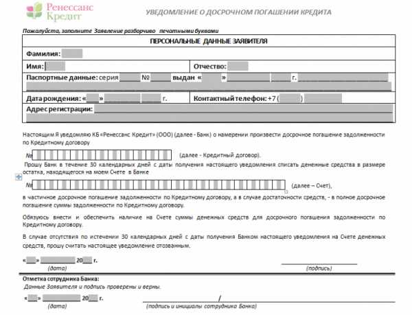 Образец заявления о досрочном погашении кредита на примере Ренессанс кредит банка