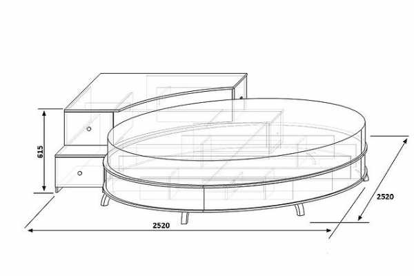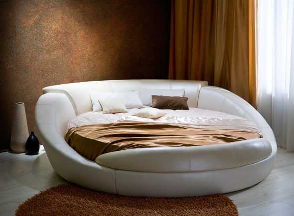 Самой популярной нестандартной идеей будет круглая кровать с двумя местами для сна. Даже при самых минимальных габаритах, ложе будет достигать 220 см в диаметре. А если помещение и финансовые возможности позволяют, то диаметр можно и увеличить. Например, для спального места с размерами 200х160 потребуется круглая модель, диаметром 265 см без учета спинки.