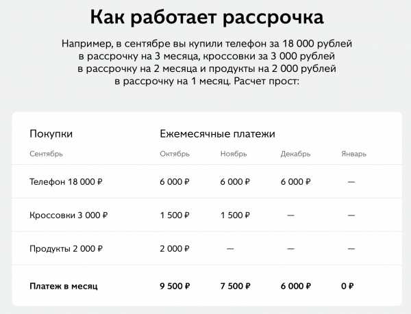 Сумма товара делится на указанное количество месяцев. Чтобы покупка стала беспроцентной, необходимо своевременно вносить ежемесячные платежи.