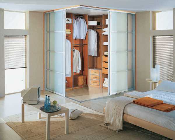 Каркасная угловая гардеробная в спальне имеет свои достоинства: