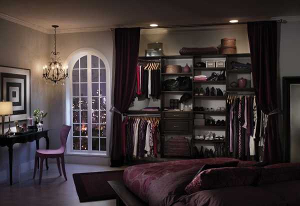 СПРАВКА! Сделанная без дверей гардеробная комната не испортит дизайн спальни, особенно если внутренняя обстановка (шкафчики, полки) подобраны под цвет мебели в комнате.