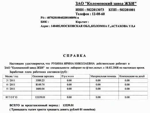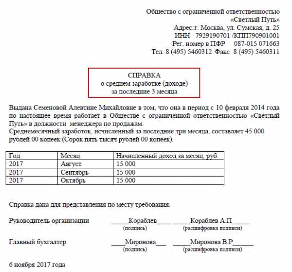 Ниже вы можете увидеть бланк справки о среднем заработке с примером ее заполнения: