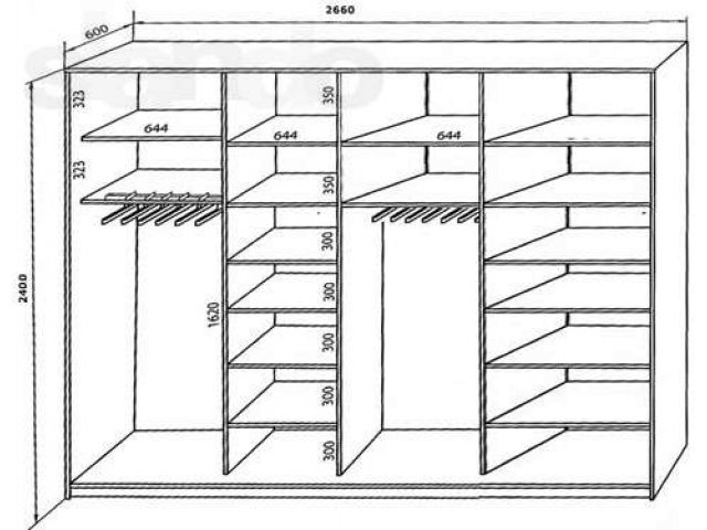 Встраиваемые шкафы немного напоминают конструкцию шкафов-купе. Чертежи шкафов такого рода делаются достаточно просто. Достаточно знать размеры ниши, в которую планируется поместить содержимое шкафа.