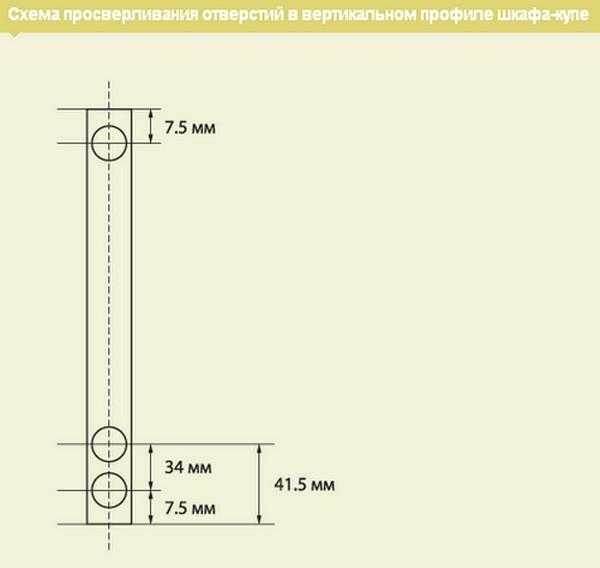 Следующий шаг – засверливание вертикального профиля. Здесь необходимо быть предельно внимательным, потому что у разных производителей варьируется диаметр крепежных и регулировочных винтов. Неизменным остаётся лишь высота сверления на профиле, которую вы можете увидеть на следующем рисунке. Не забудьте потребовать у поставщика шестигранные ключи – оригинальный «Командор» вообще выпускает винты собственного стандарта, и шестигранник из автомобильного набора «не прокатит».