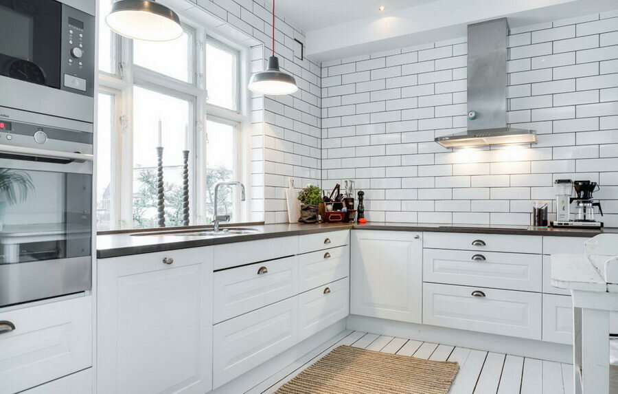 Этот вариант кухни без верхних шкафов встречается чаще всего. Он хорошо подходит для таких стилей, как лофт и прованс.