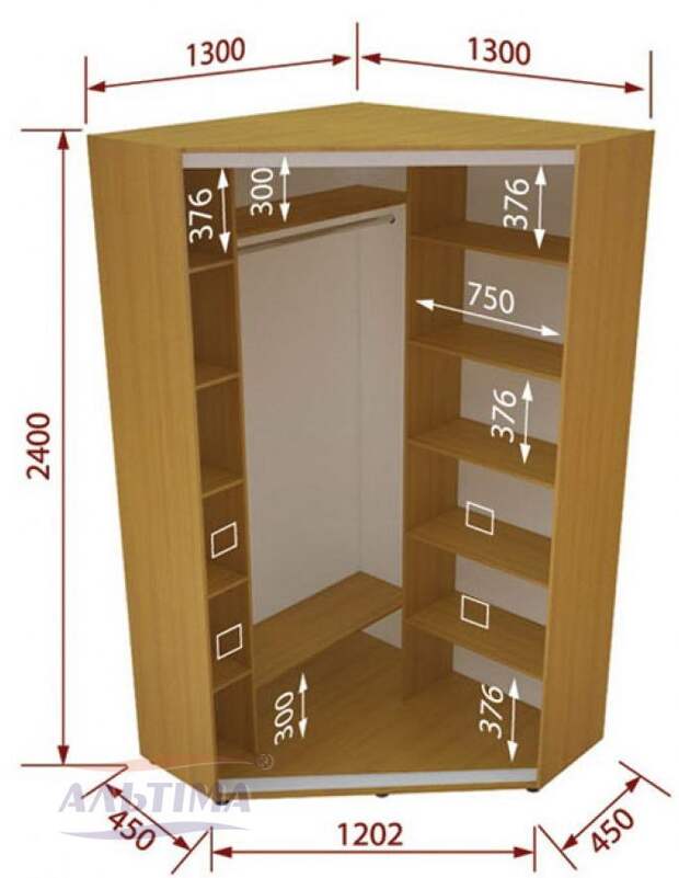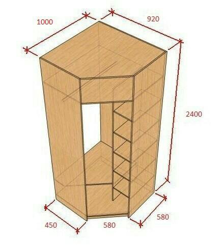 Данная модель предназначена как «вставка» между двумя примыкающими секциями в общей стенке. Это самая распространённая и простая в изготовлении конструкция, деталировку которой можно срисовать с углового кухонного шкафчика, пропорционально увеличивая габариты. Если рассматривать его как отдельно стоящую секцию – становится очевиден несоразмерно большой расход материала при малой функциональности. В такой шкаф поместится меньше вещей, чем в обычный прямой, а места в квартире он займёт больше – нерабочий «треугольник» позади фасада нерационально «съедает» пространство.