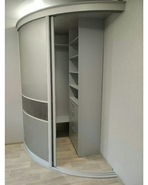 Если говорить про Г-образные конструкции, то они представляют собой два отдельных короба, которые затем соединяются друг с другом. Можно сделать как привычный шкаф купе, так и с распашными дверцами. В результате вы получаете большой шкаф, в котором можно удобно хранить одежду, какие-то другие мелкие вещи. Однако у такой конструкции есть и определенный минус — шкаф «съедает» пространство. Помимо самого угла, в котором размещается предмет интерьера, он также занимает площадь между диагоналями.