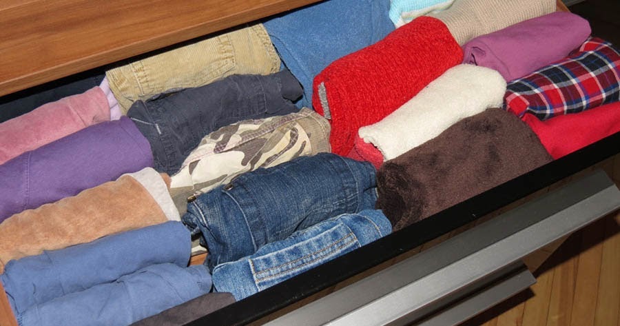 Конмари рекомендует скручивать вещи для хранения в небольшие рулоны либо складывать в тонкие ровные прямоугольники. Тогда одежда не мнется, а аккуратно располагается в ящике. Со стороны это смотрится как сложенные книги или папки.