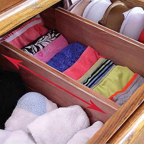 Разместите предметы гардероба в ящики для хранения вещей в шкафу. При этом делите все по категориям, например, футболки, джинсы, белье и т. д. Края одежды не должны выступать за пределы ящиков. Мелкие предметы сворачивайте в рулончик. Хорошо, если вы сразу распределите все и по цветовой гамме, тогда потом будет проще подбирать комплекты.