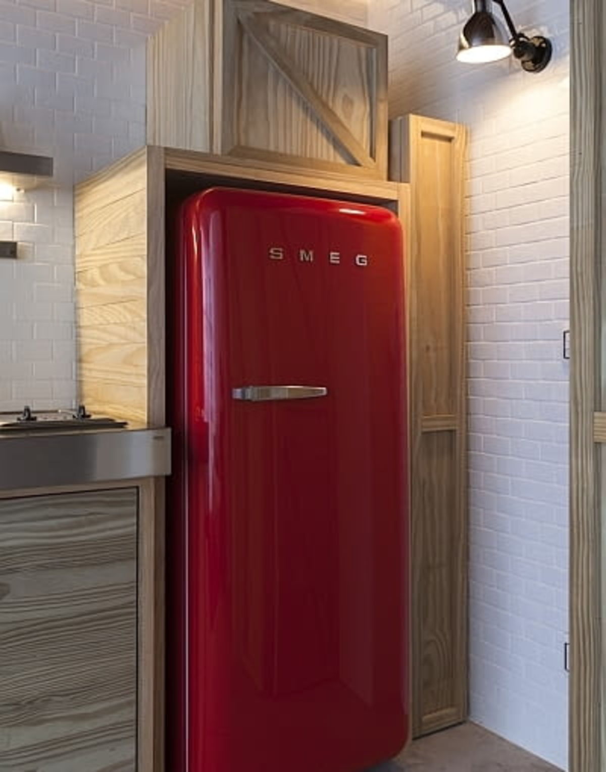 Он то стоит громадой среди аккуратных шкафчиков, то выделяется своей современностью на фоне ретро-стиля… Холодильник, встроенный в шкаф, решает все эстетические проблемы одновременно.