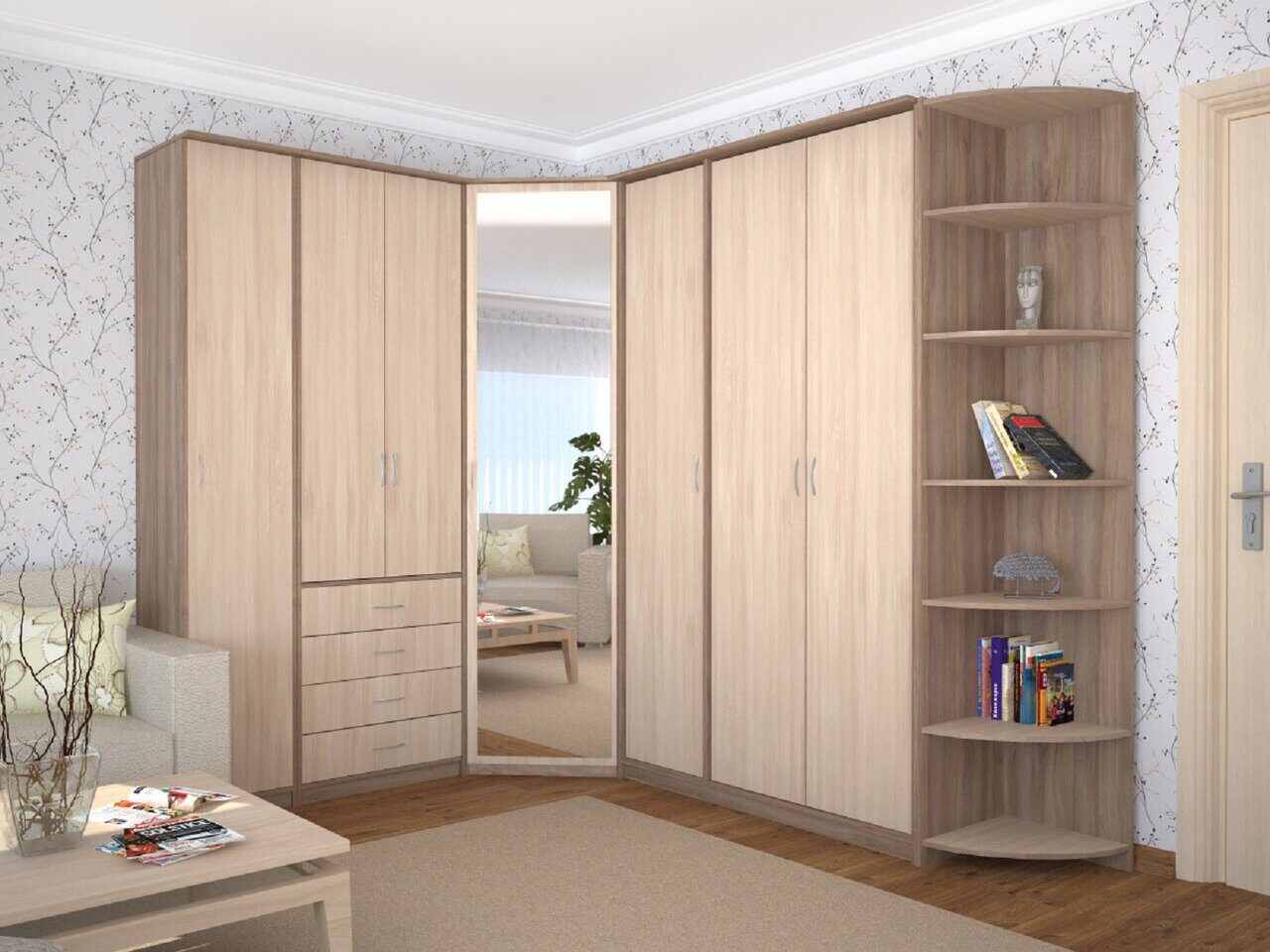 Угловой шифоньер размещается в различных комнатах, и для каждой из них подбираются конструкции соответствующих форм и размеров.