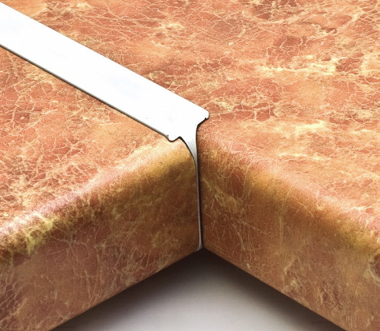 Одним из способов кромкования является применение П-образного накладного профиля. Он особенно актуален для мебели, которая часто подвергается воздействию влаги. Благодаря специальной форме, профиль надежно защищает торцы столешницы от механических повреждений. Среди достоинств отмечают и возможность скрыть под ним уже имеющиеся дефекты. Накладной профиль не рекомендуется для небольших столешниц, так как он зрительно увеличивает объемы поверхности. К преимуществам изделия относят возможность самостоятельного монтажа, а при необходимости реконструкции части кромки.