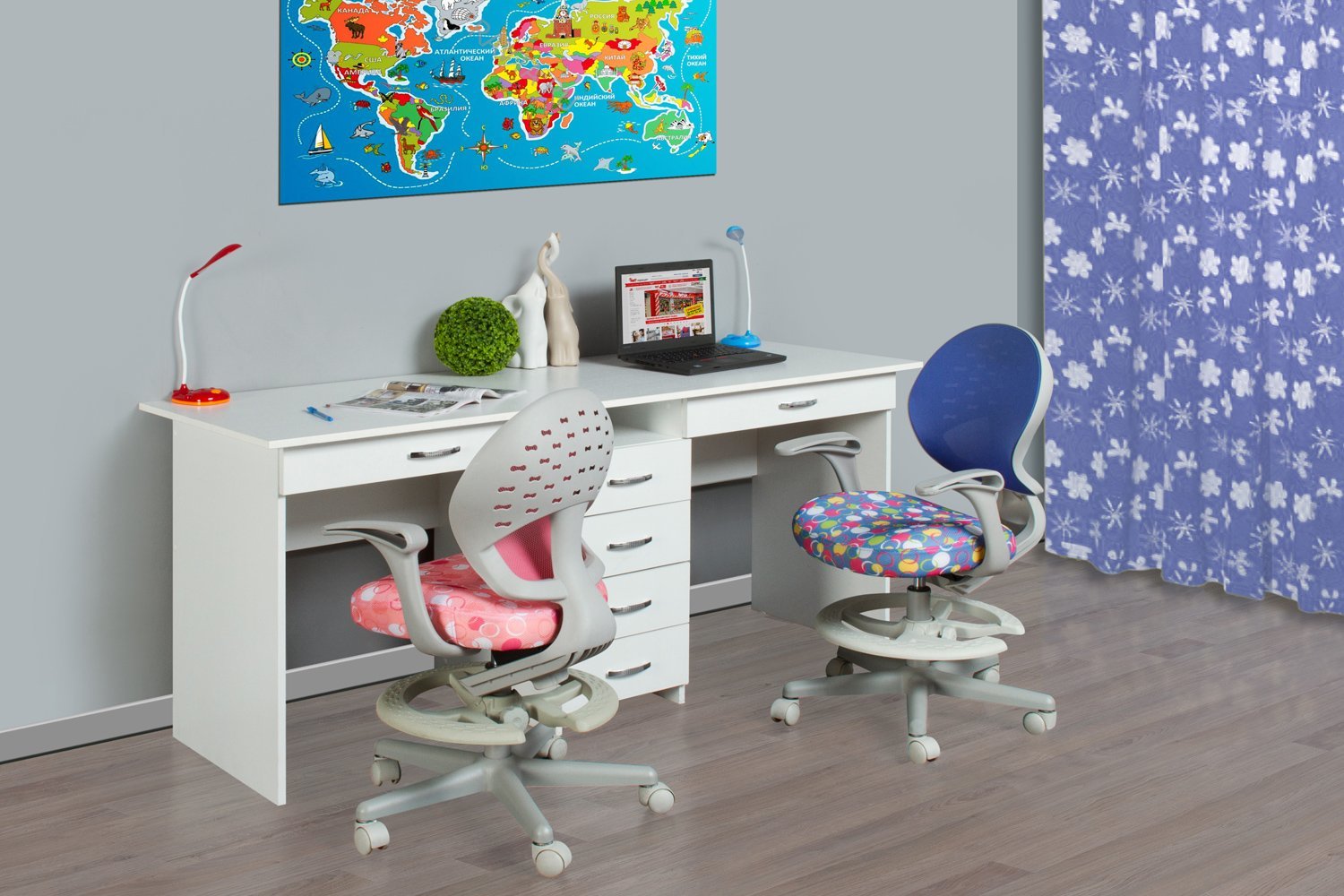 При таком дизайне дети сидят друг к другу под прямым углом, что позволяет не только оптимизировать рабочее место, но и дать им личное пространство. Но для этого варианта детская должна быть довольно большой — это рабочее место займет много пространства.Важно, чтобы размеры рабочих мест были одинаковыми.