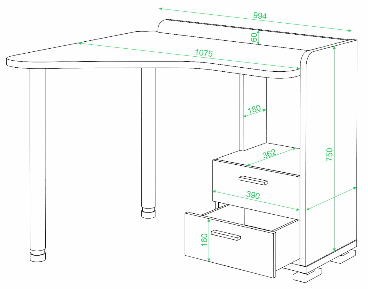 Зачастую угловой письменный стол совмещает функции компьютерного. Конструкция имеет приспособления для клавиатуры, системного блока и монитора. Для них предусмотрены следующие параметры: