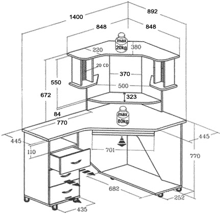 На верхнюю полку можно установить принтер, книги или сложить нужные вещи. Здесь они всегда будут под рукой. Изготовление чертежа для этой модели также начинается с определения габаритов столешницы. После этого определяются размеры боковин.