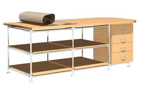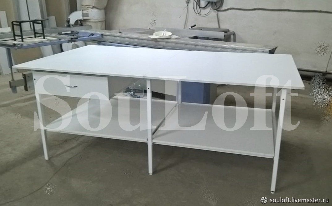 Теперь, несколько слов о том, из чего делают Раскройные столы. Наиболее часто используемый материал – ДСП. Тому есть несколько причин. Первая из них – подходящая ширина листа. Вторая – очень удобно подобрать длину, для этого будет достаточно 2-х листов. Основу стола можно выполнять из металлических уголков. Для большей устойчивости стола внизу делается рамка из тех же уголков. Таким образом, у вас появится дополнительная полка, чтобы хранить рулоны и крой.
