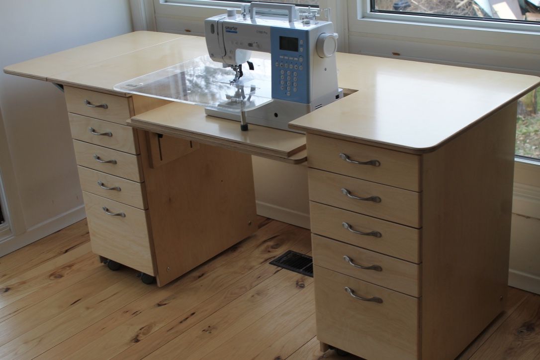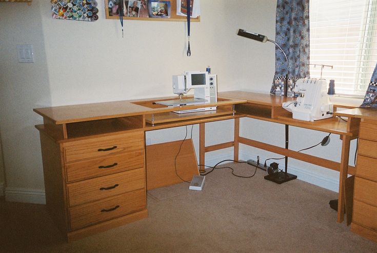 Если в планы не входит маскировка стола, имеется более чем одна швейная машина и позволяет место, можно сделать угловой стол. В ящиках можно поместить множество мелких предметов, нужных для шитья.