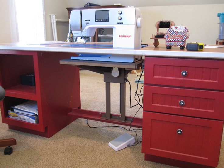 «Утапливаемое» место для машинки также довольно частое явление в готовых столах. Посмотрите на свою швейную машину — на ней могут быть ящички и съёмные платформы, которые не дадут «утопить» машинку в стол — учитывайте это при покупке или самостоятельном изготовлении стола. |