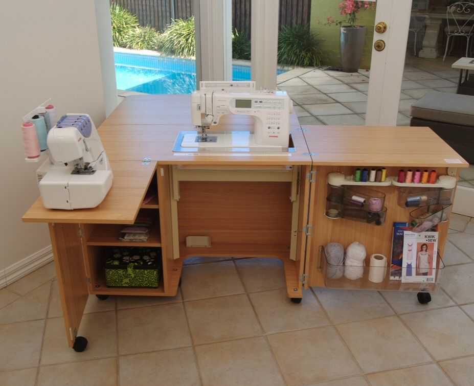Существует и бюджетная мебель для занятий рукоделием. К ней можно отнести швейный столик типа «книжка» — популярная раскладная конструкция. Чтобы раскроить материал, можно поднять обе боковые створки стола. Для пошива небольших изделий достаточно поднять одну створку стола и установить на ней швейную машинку.