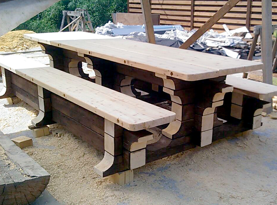 Брус – это основной материал, который применяют в большинстве случаев для создания опор будущего стола. Однако бывают варианты, когда делают весь стол из бруса своими руками. Это более сложный проект, однако и конечный результат выглядит намного привлекательней. Так что выбирать Вам.