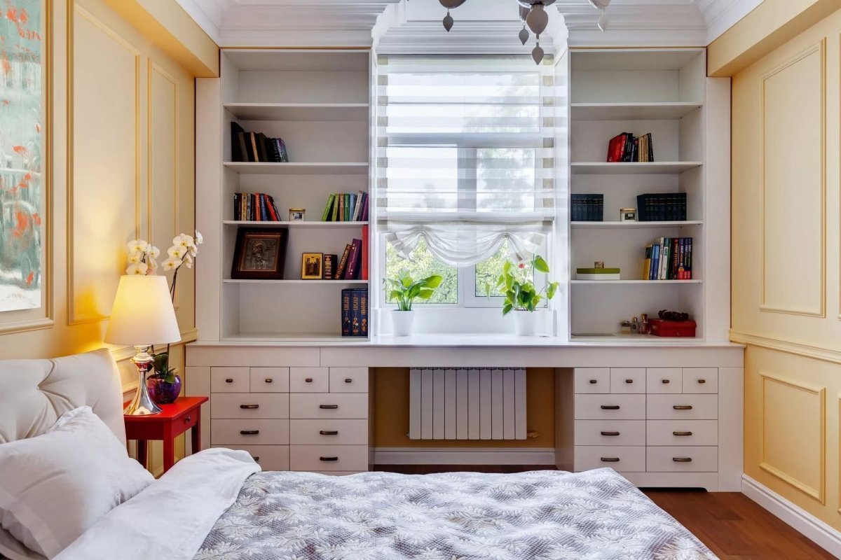 детская для двоих, планируем вдоль окна сделать столешницу, по бокам стелажи. вопросы для размышления: — столешница из дерева, пластика? — каким способом не преграждать тепло от батареи.