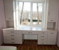 У нас стол вдоль окна, кухонная столшница лежит на 3-х тумбах, длина 2.20( и такие комнатушки бывают). Муж сам делал. По бокам на стенках полки одинаковые. половина открытая, половина с дверцей, открывается вверх, на доводчиках. Когда надоедает у окна, я ей разворачиваю вдоль стены.