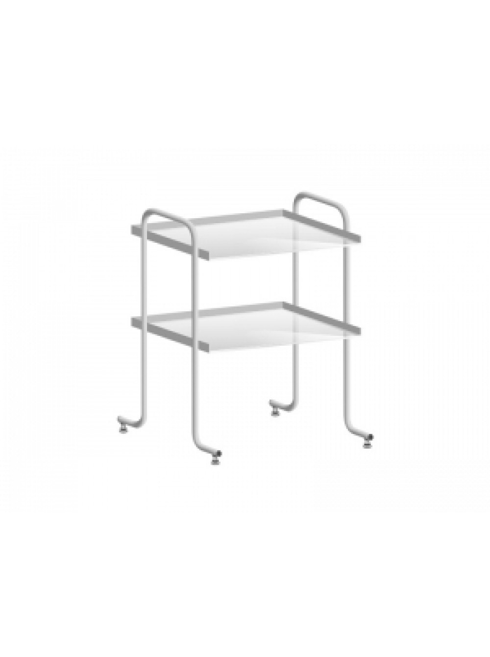 Столик изготовлен полностью из метала. Состоит из 2-х стеклянных полок. Каркас металлический. Четыре самоориентирующихся колеса диаметром 70 мм