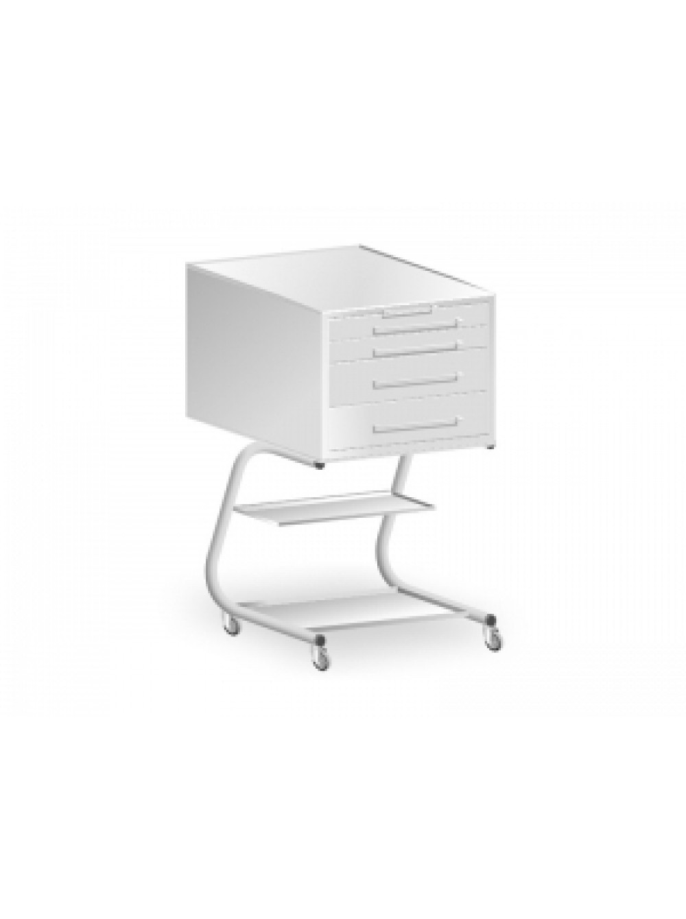 Тумба изготовлена полностью из метала. Состоит из 3-х выдвижных горизонтальных ящиков и снабжена ручками для открывания, рабочая поверхность из стекла, четыре самоориентирующихся колеса диаметром 70 мм, ручки из хромированного метала. Наличие бортиков предохраняет инструменты и материалы от случайного падения на пол.