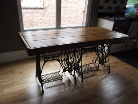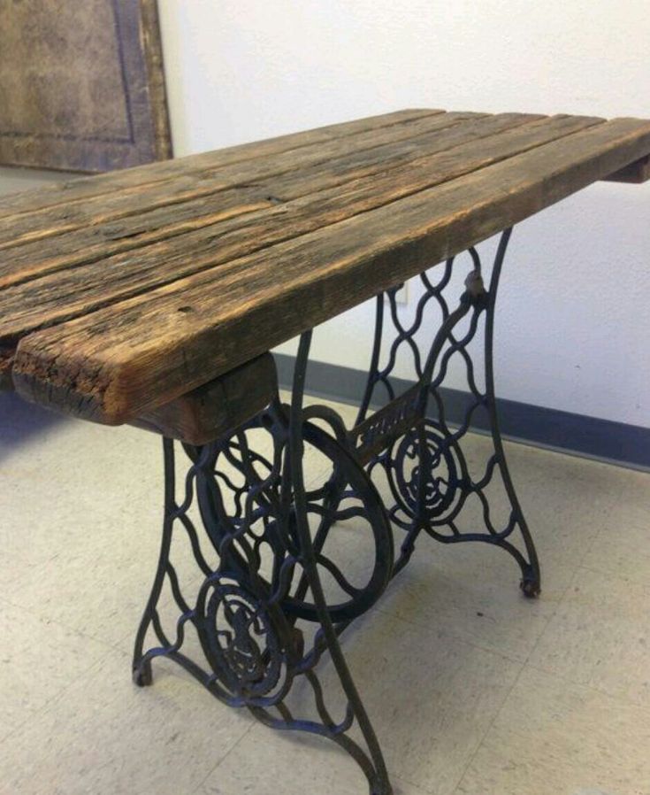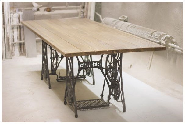 1. Самое простое, что может получиться из чугунного основания старой швейной машинки — это отличный обеденный стол. Тяжелая витиеватая станина выдержит даже довольно широкую столешницу. Как здорово, собраться всей семьей за одним столом и вспомнить о том, что было раньше…