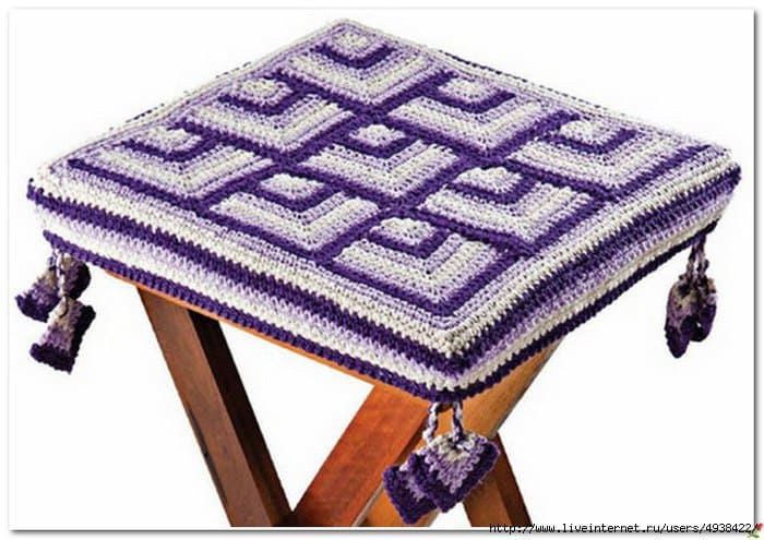 Еще можно сделать несколько основных квадратиков, где полоски будут сплетаться в шахматном порядке. Кроме того, интересно будут смотреться чехлы, выполненные с помощью цветных мотивов. Соединяются они таким же образом, как и в первом случае.