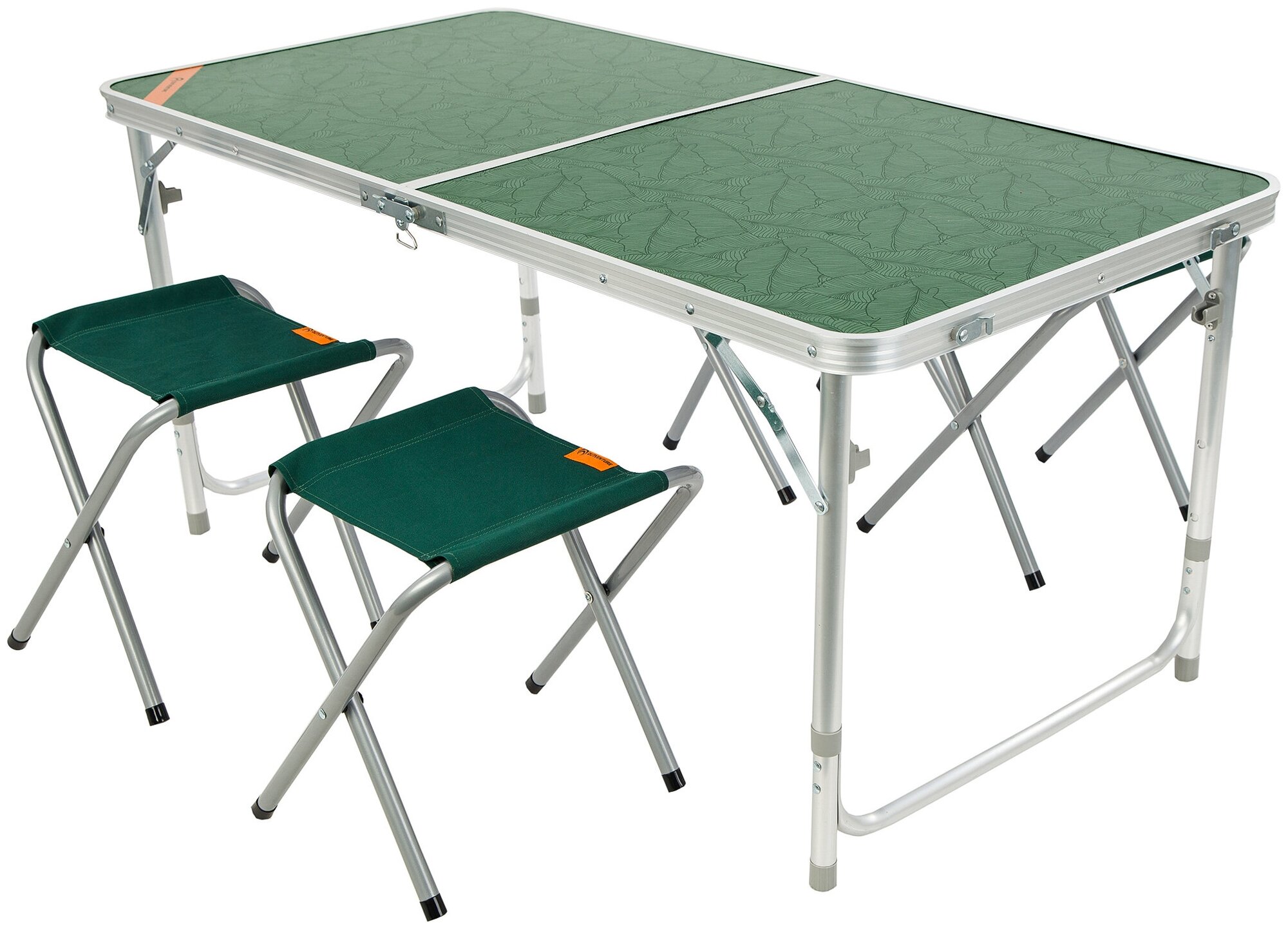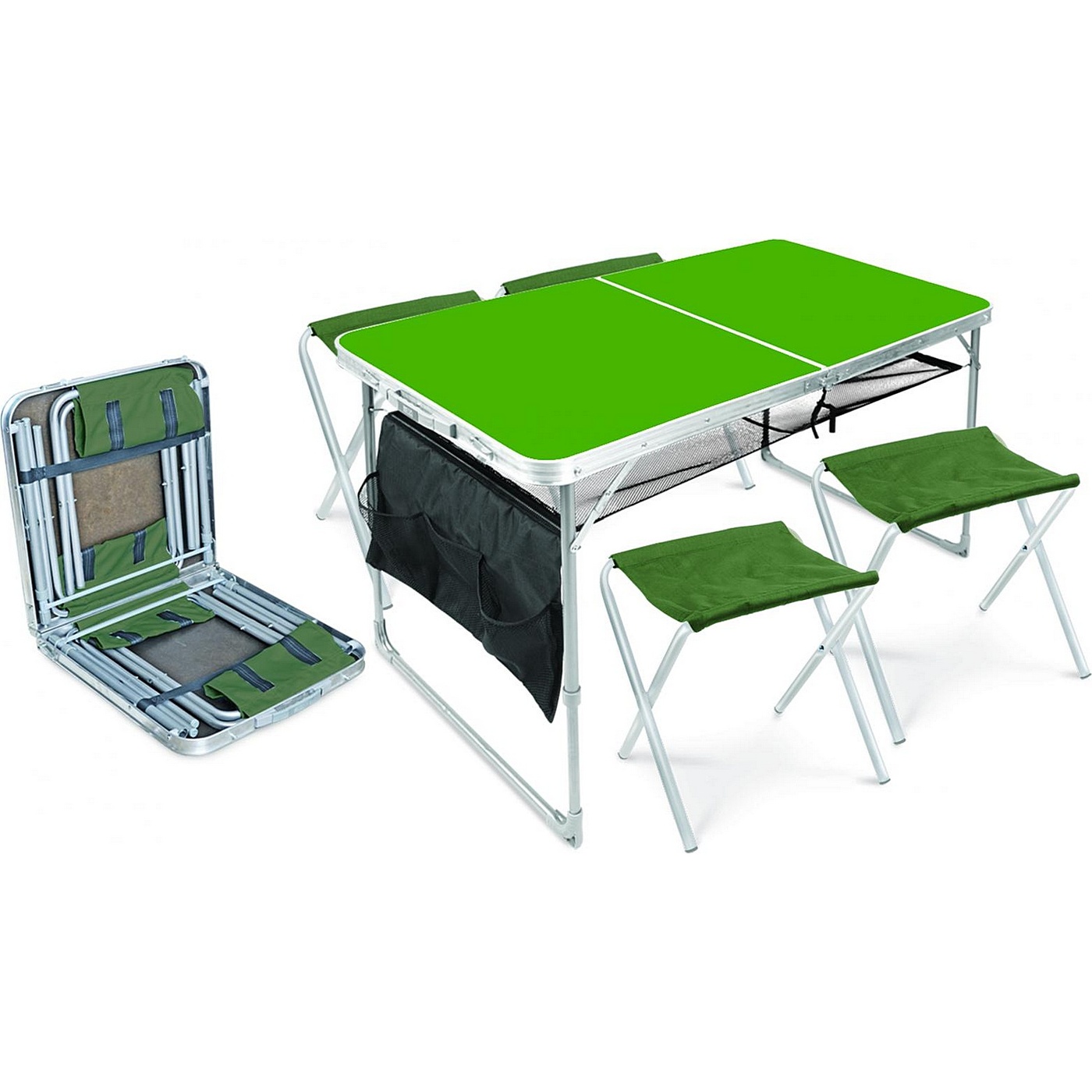 Отзывы туристов дают хорошие оценки распространенной модели стола-трансформера, превращающегося в чемоданчик для входящих в комплект табуретов. Жесткая, а поэтому максимально удобная столешница площадью почти 2 квадратных метра, сворачивающиеся внутрь металлические ножки-телескопы и 4 текстильных табурета с металлическим каркасом Х-вида в сумме весят всего 6-7 кг.