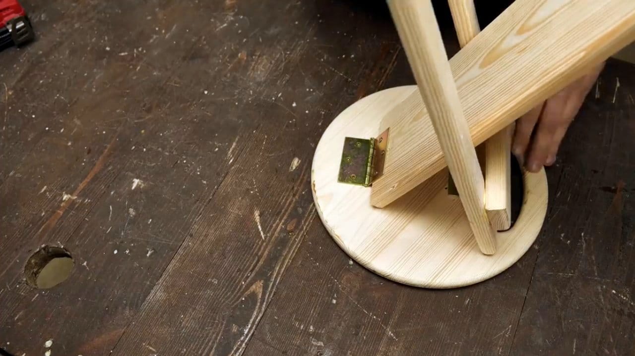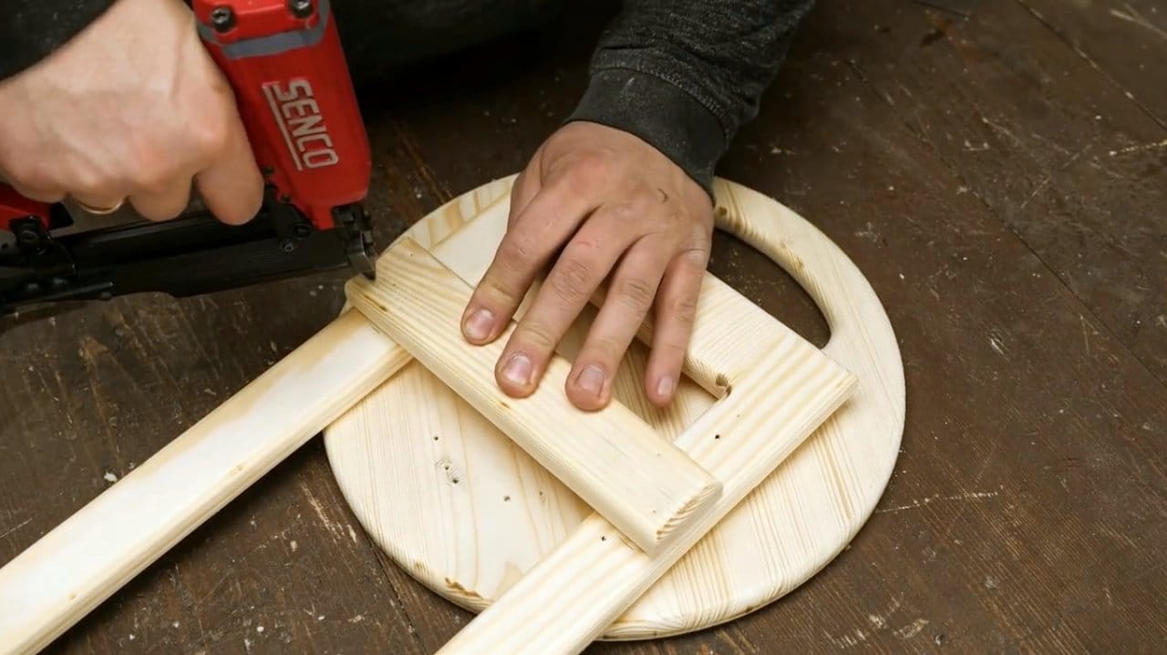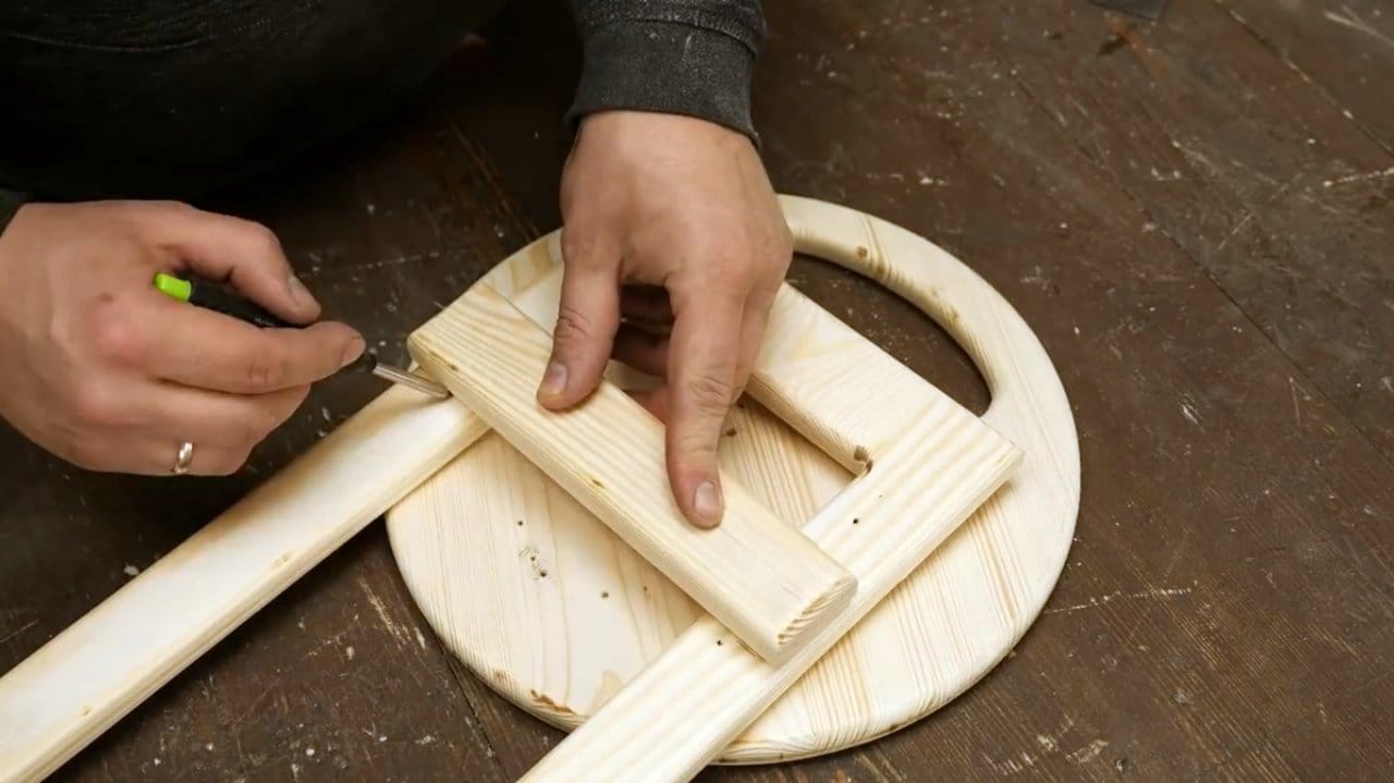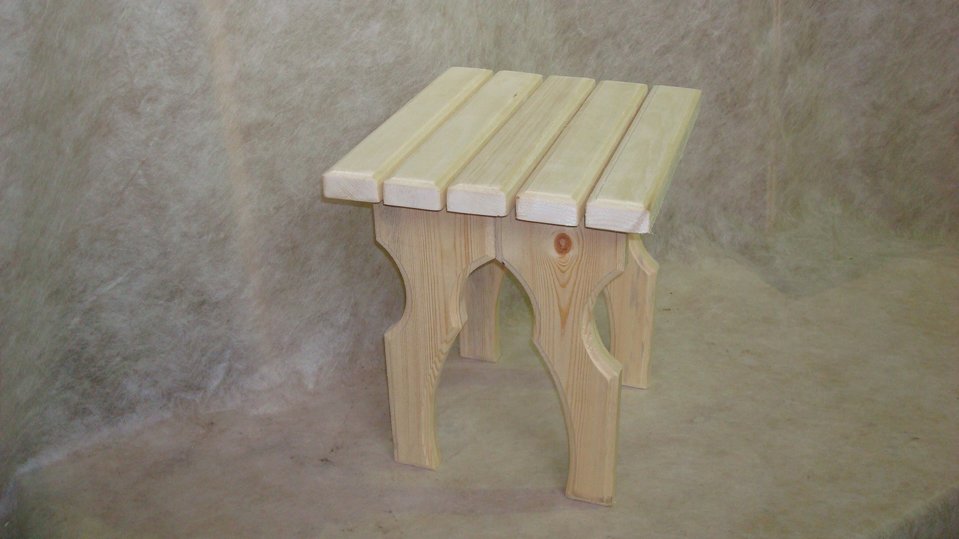 Далее — установка ножек. Выбираем четыре доски одинакового размера, проверяем их длину, корректируем при необходимости. Затем — снова шлифовка. Так проще, чем шлифовать уже прикрученные ножки. Отшлифованные доски прикручиваем к раме. Это и будут ножки На каждую — по два самореза, закрепелнных в диагональ (смотрите на фото). Для большей устойчивости внизу устанавливаем перемычки. От пола до перемычек можно оставить около 10 см. Все соединяем саморезами, чтобы доски не треснули, предварительно сверлим отверстия.